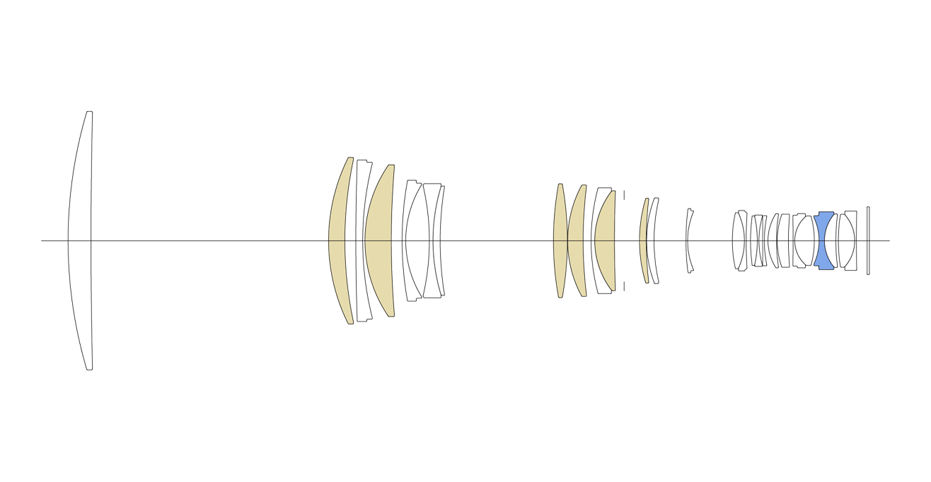 Objektív felépítése28 lencsetag in 21 csoportban (6 FLD, 1 SLD lencsetag)